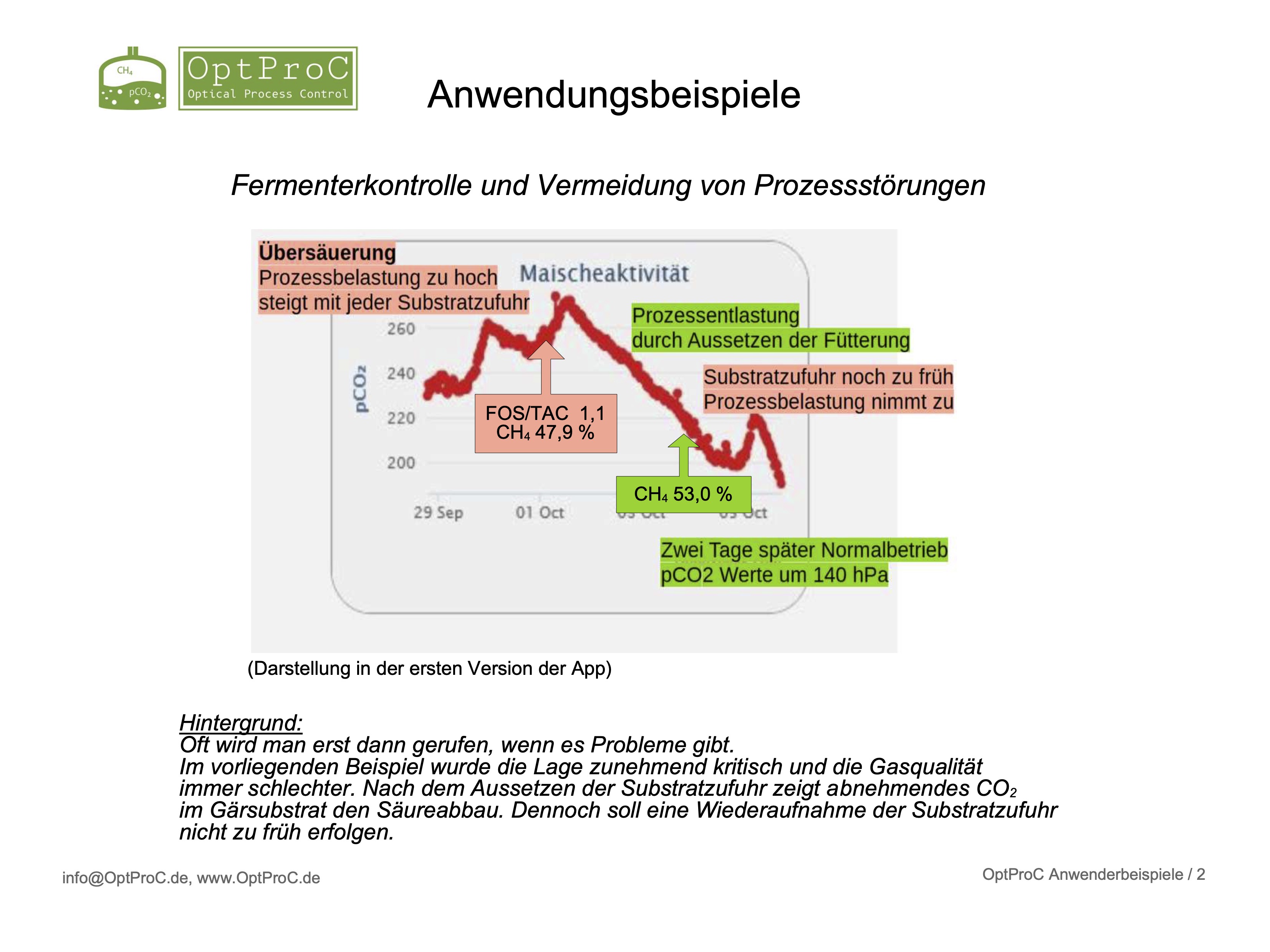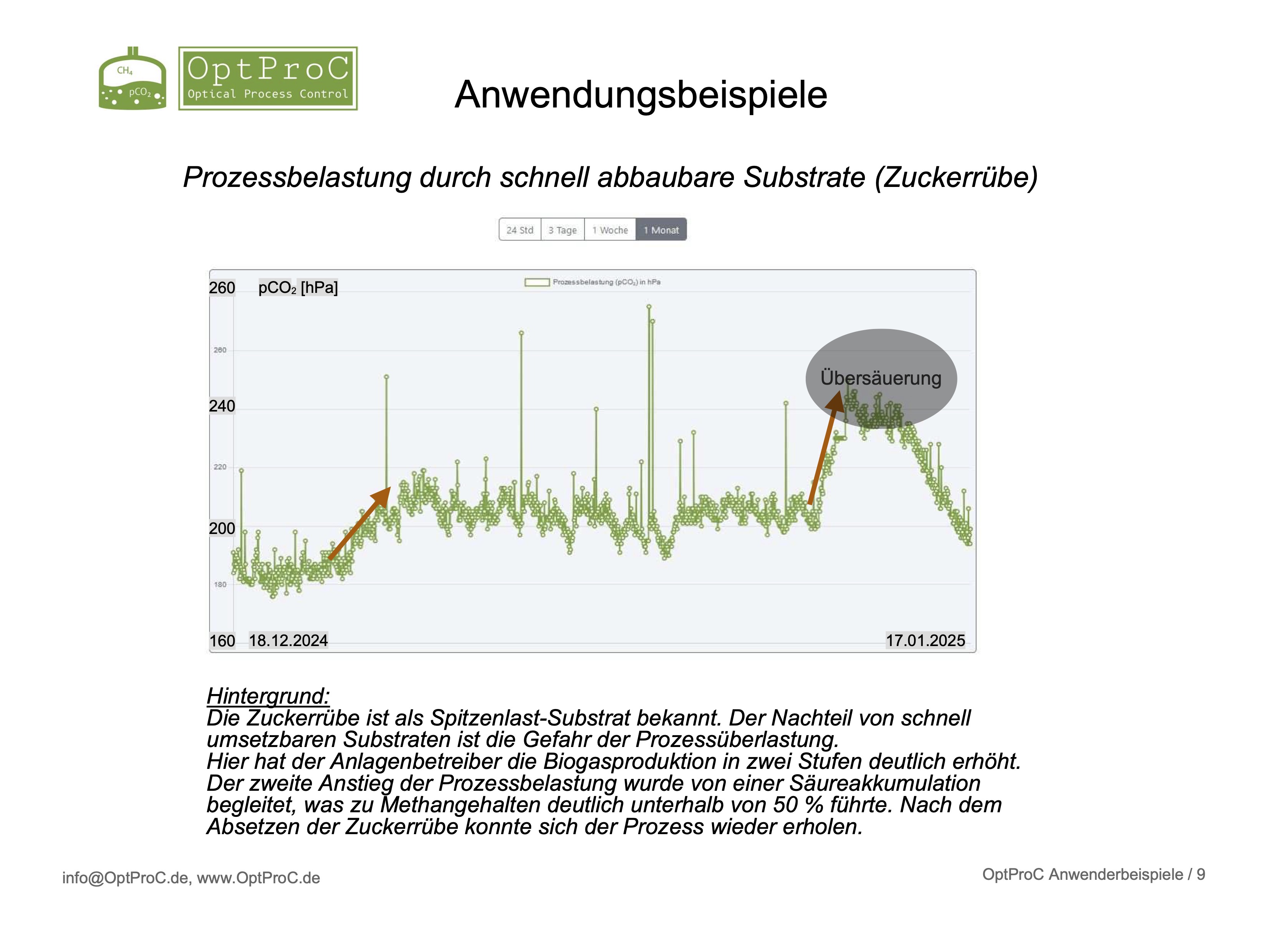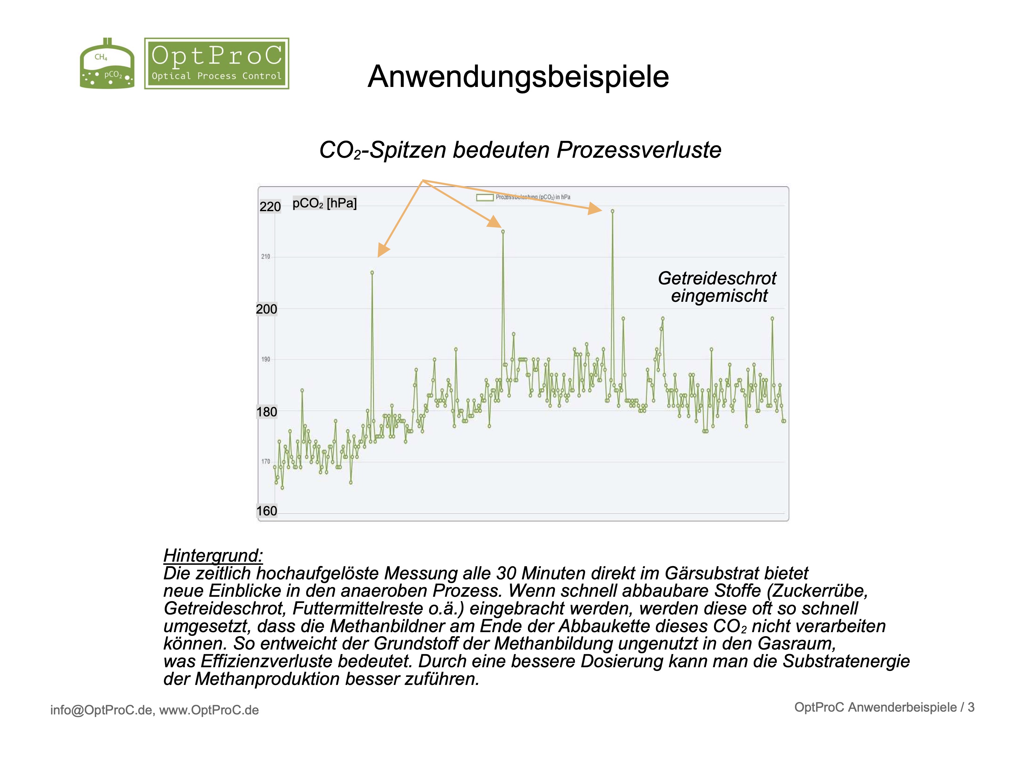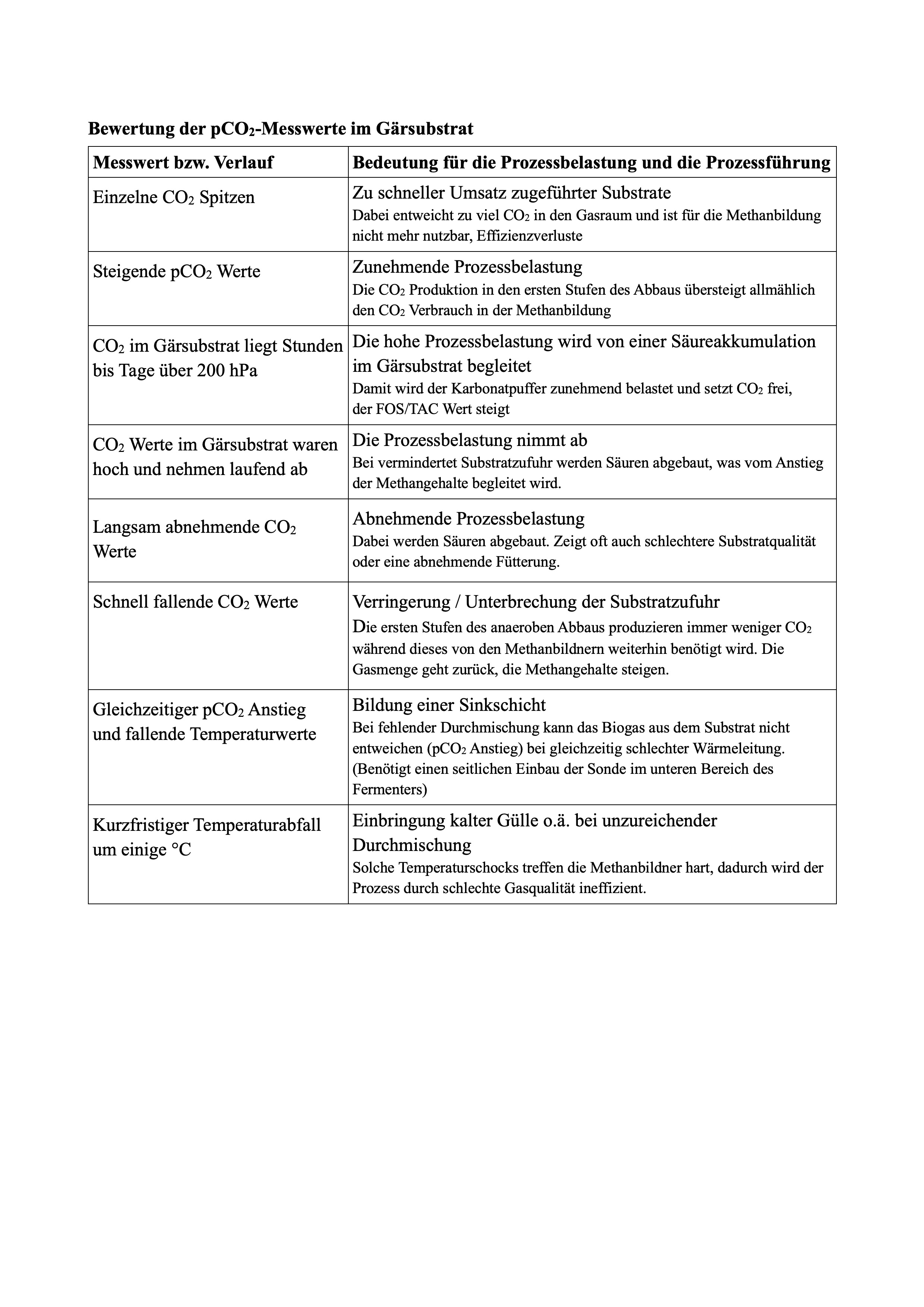 Übersteigen die ersten drei Schritte des Abbaus die Kapazität der Methanbildung, nimmt das CO2 im Gärsubstrat zu und die Effizienz nimmt ab. Gleichzeitig wird die Gasqualität schlechter. Die halbstündig gemessenen CO2 Werte im Gärsubstrat geben auch weitere Hinweise auf die Prozesse im Fermenter.