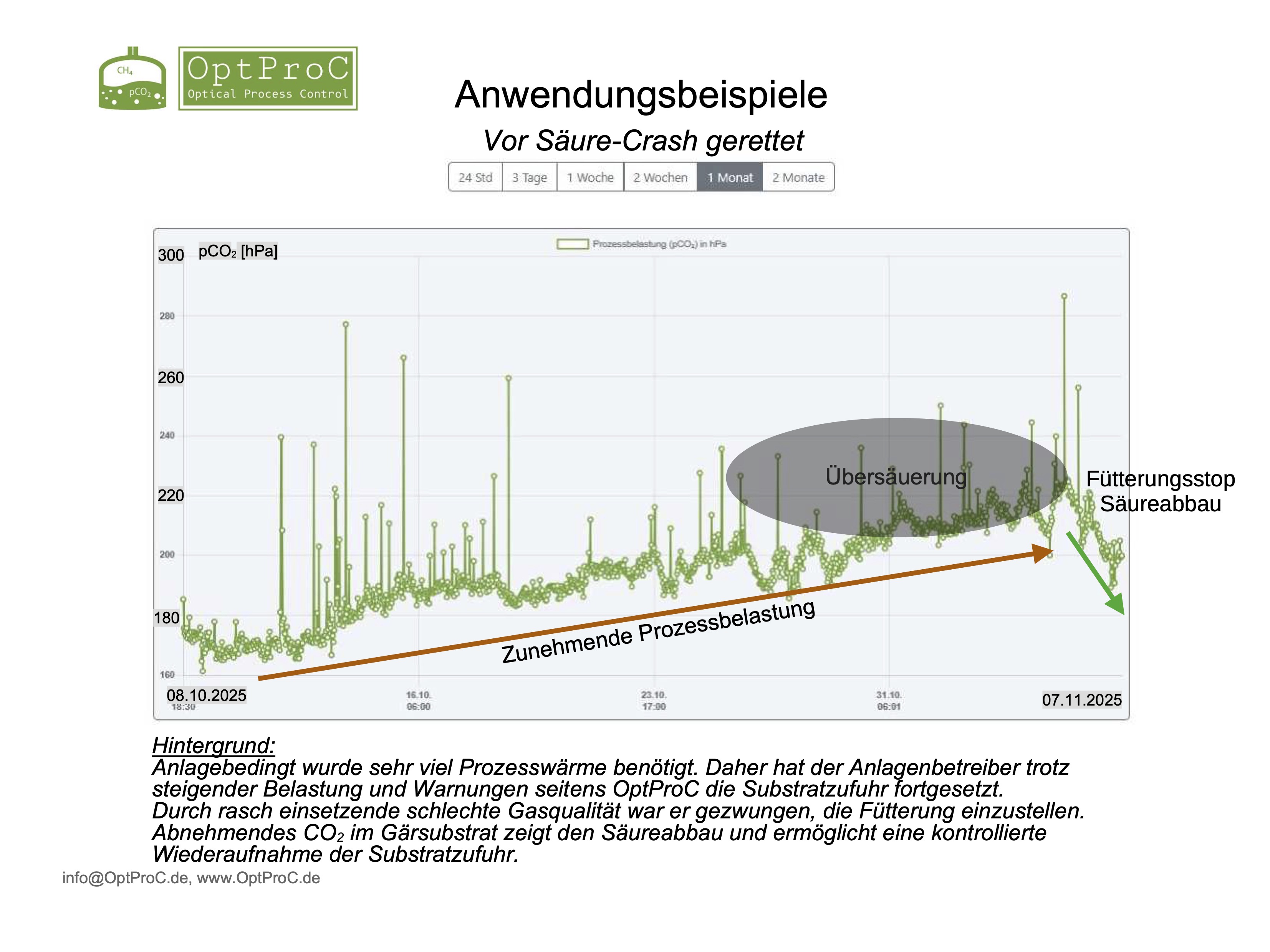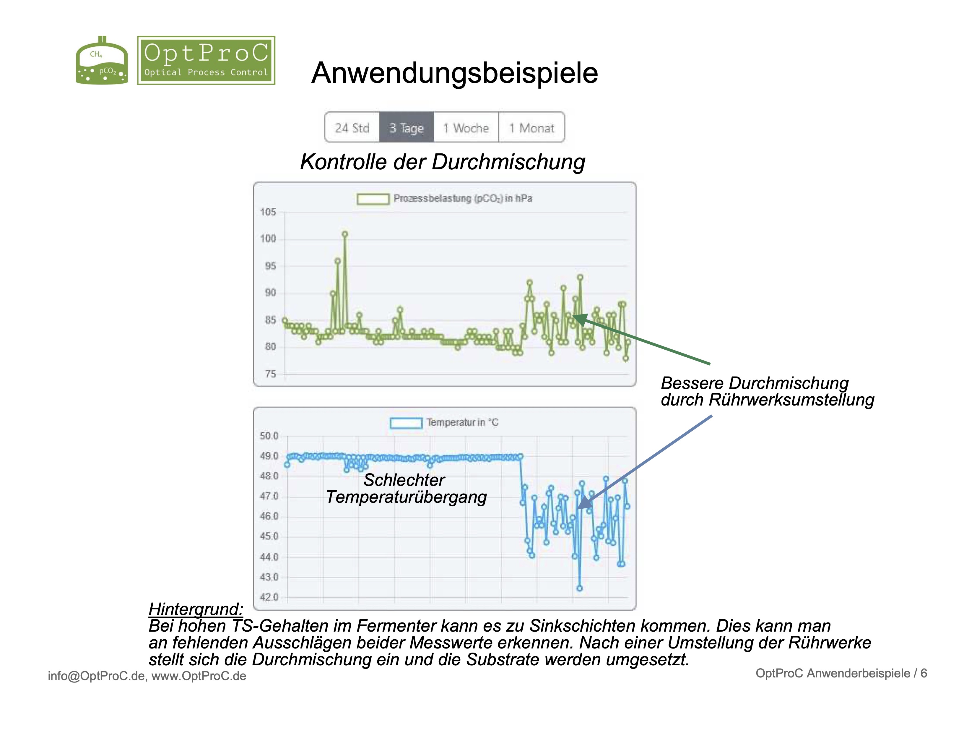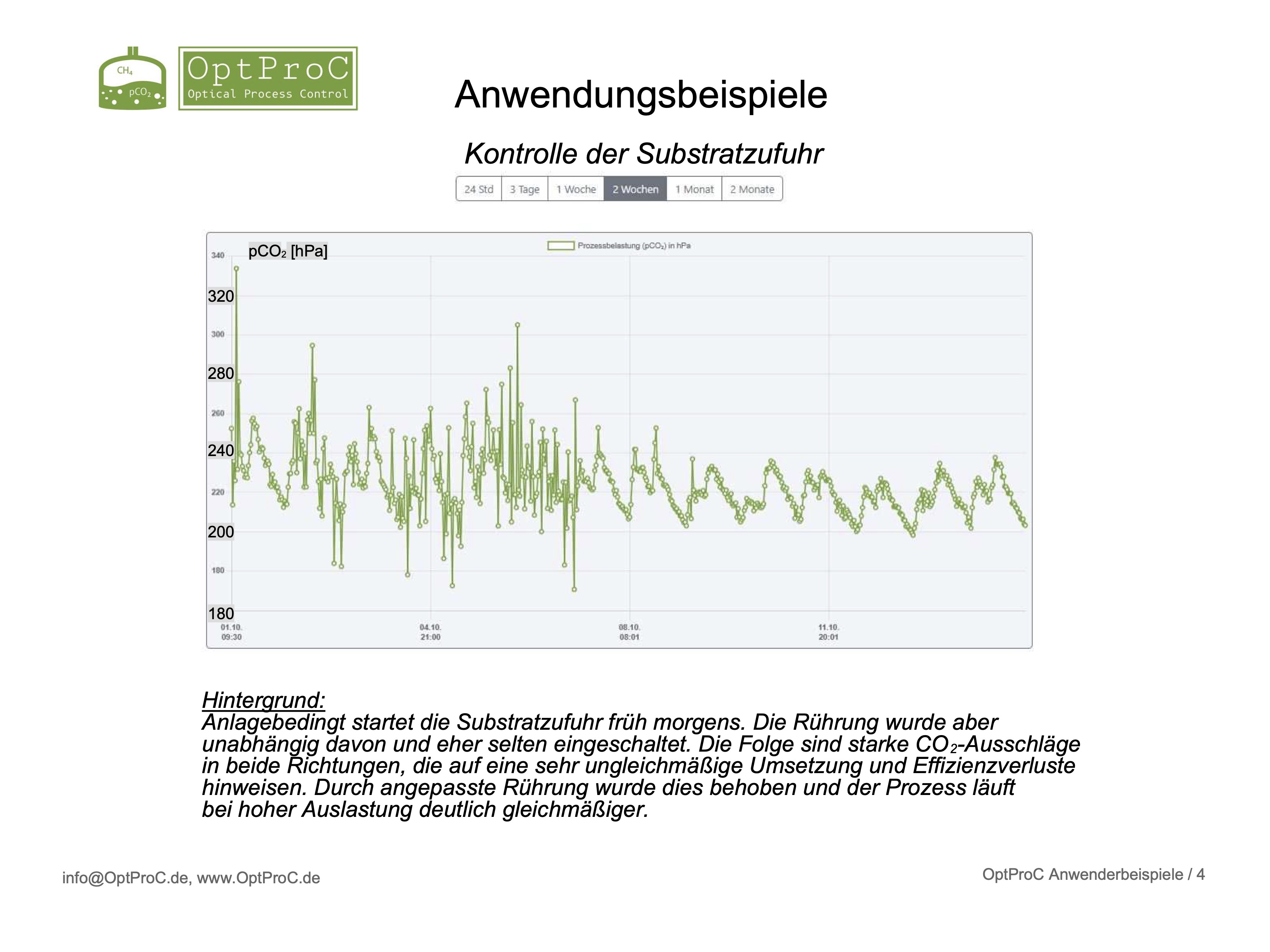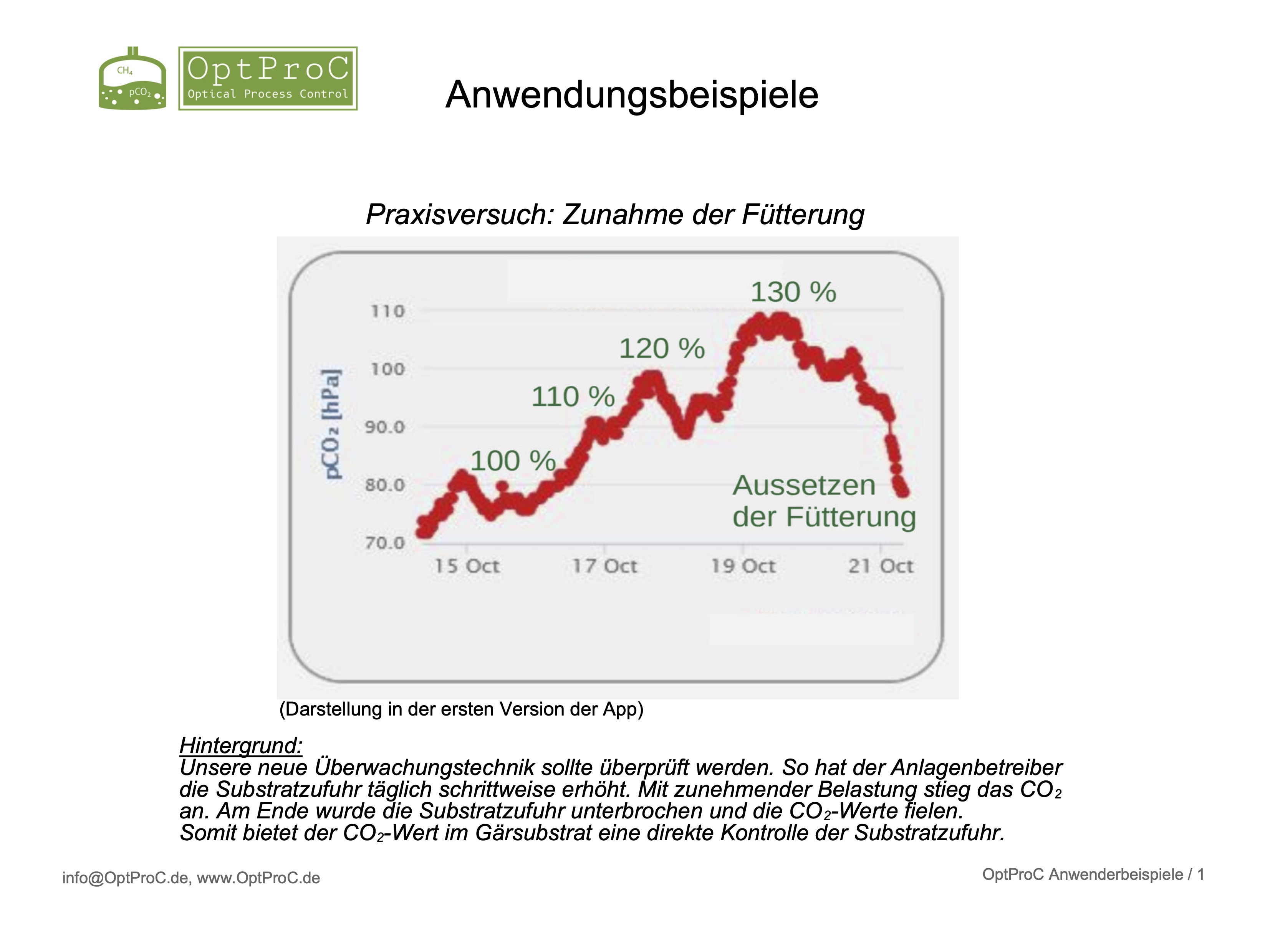 Übersteigen die ersten drei Schritte des Abbaus die Kapazität der Methanbildung, nimmt das CO2 im Gärsubstrat zu und die Effizienz nimmt ab. Gleichzeitig wird die Gasqualität schlechter. Die halbstündig gemessenen CO2 Werte im Gärsubstrat geben auch weitere Hinweise auf die Prozesse im Fermenter.