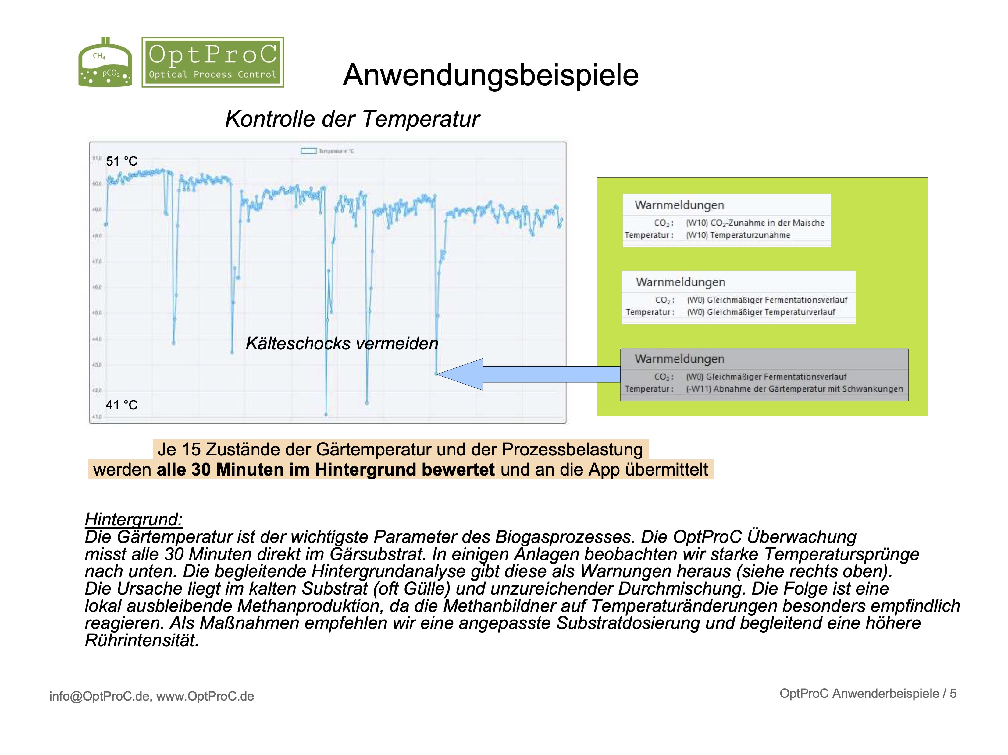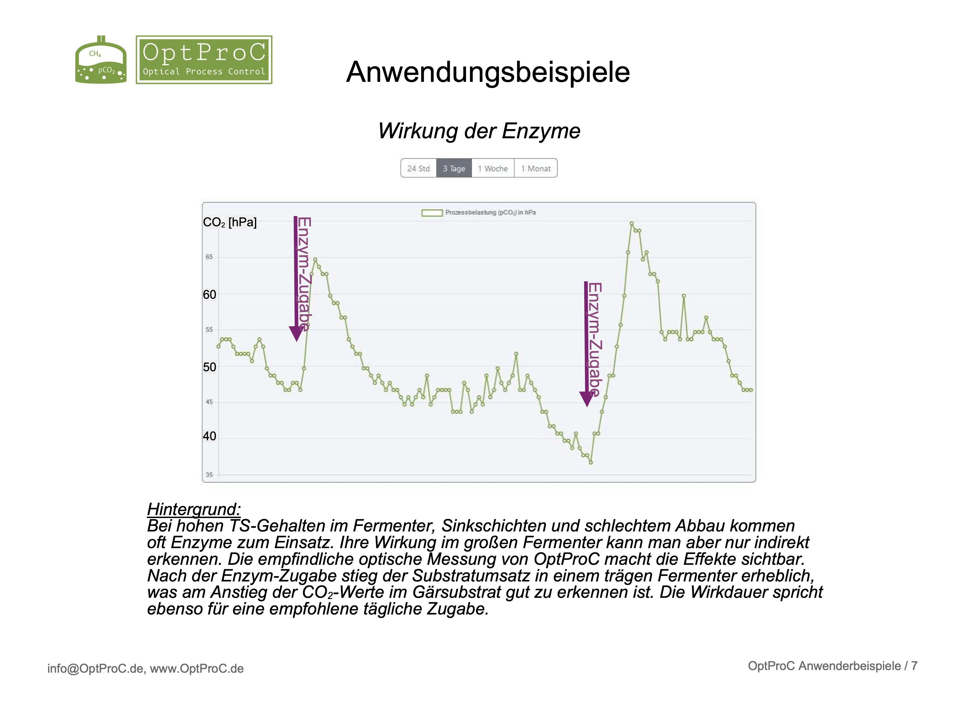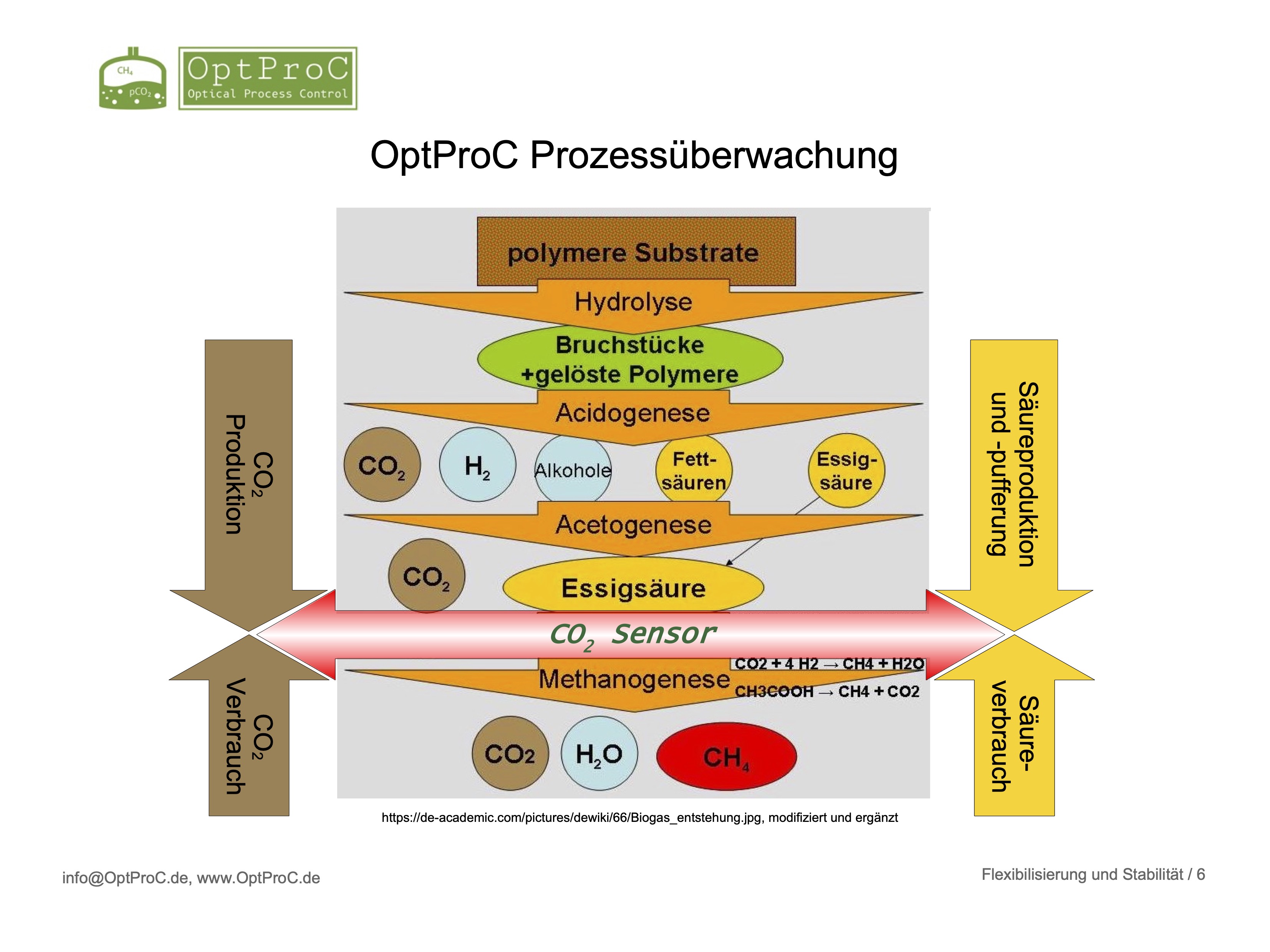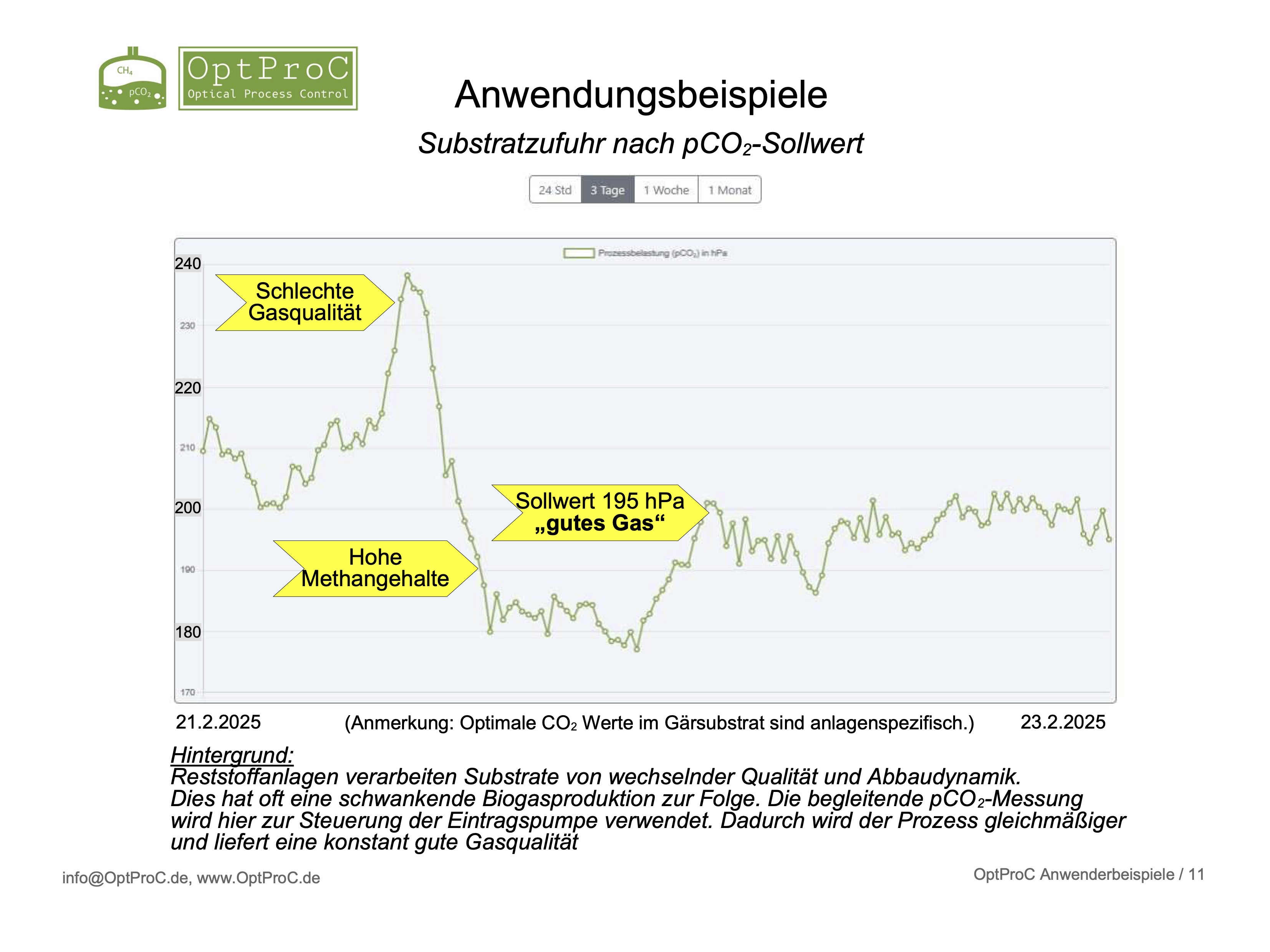 Übersteigen die ersten drei Schritte des Abbaus die Kapazität der Methanbildung, nimmt das CO2 im Gärsubstrat zu und die Effizienz nimmt ab. Gleichzeitig wird die Gasqualität schlechter. Die halbstündig gemessenen CO2 Werte im Gärsubstrat geben auch weitere Hinweise auf die Prozesse im Fermenter.